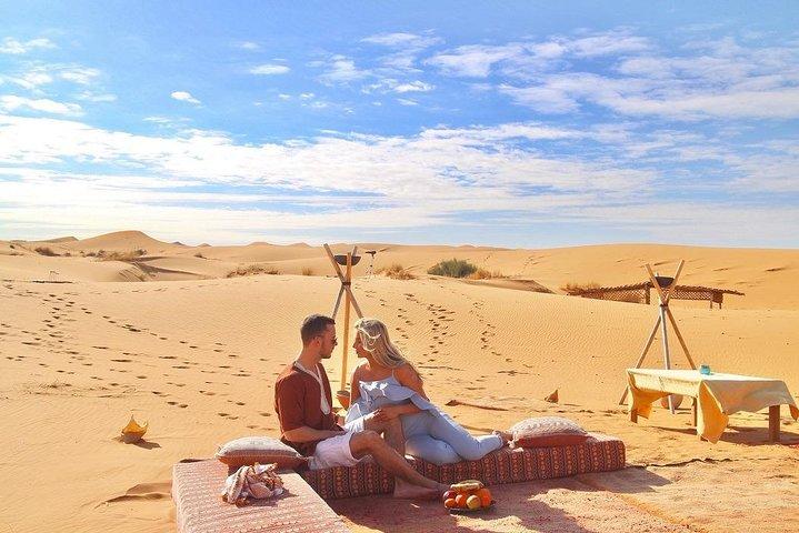 Da Fez ci dirigeremo verso l’Atlante Centrale, per visitare Ifrane, conosciuta come la Svizzera dell’Africa. Il prossimo villaggio sarà Azrou “la roccia”, un villaggio berbero noto per i suoi prodotti artigianali, i tappeti e le sculture in legno, per poi arrivare a Midelt. Si prosegue lungo la strada che attraversa il Tizi Talghemt o Collo del Camella, a 1.907 metri di altitudine. Il rilievo è impressionante, le montagne sono completamente nude, ricoperte da un manto viola. Arrivo a Errachidia e attraversamento del massiccio del Tafilalet fino al palmeto di Erfoud. Direzione deserto. Notte in campo nomadi berbero.